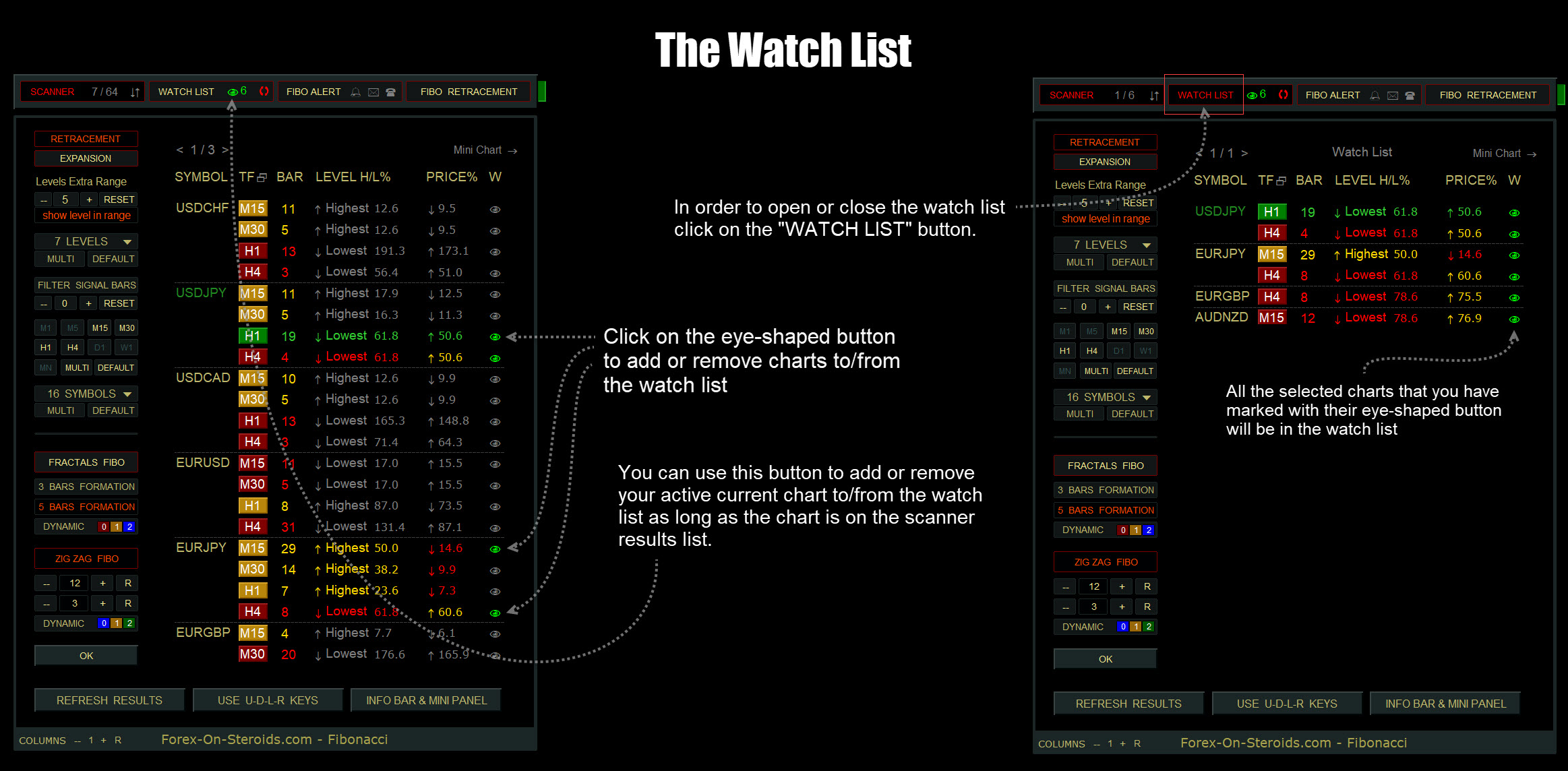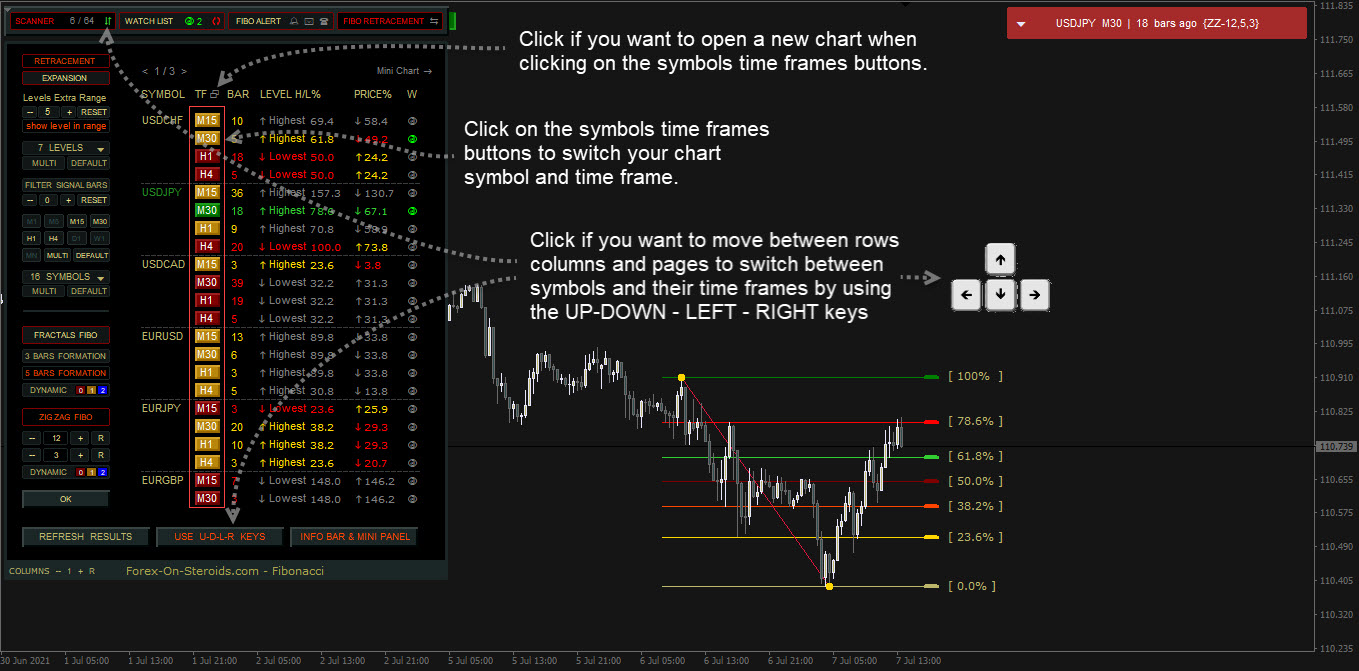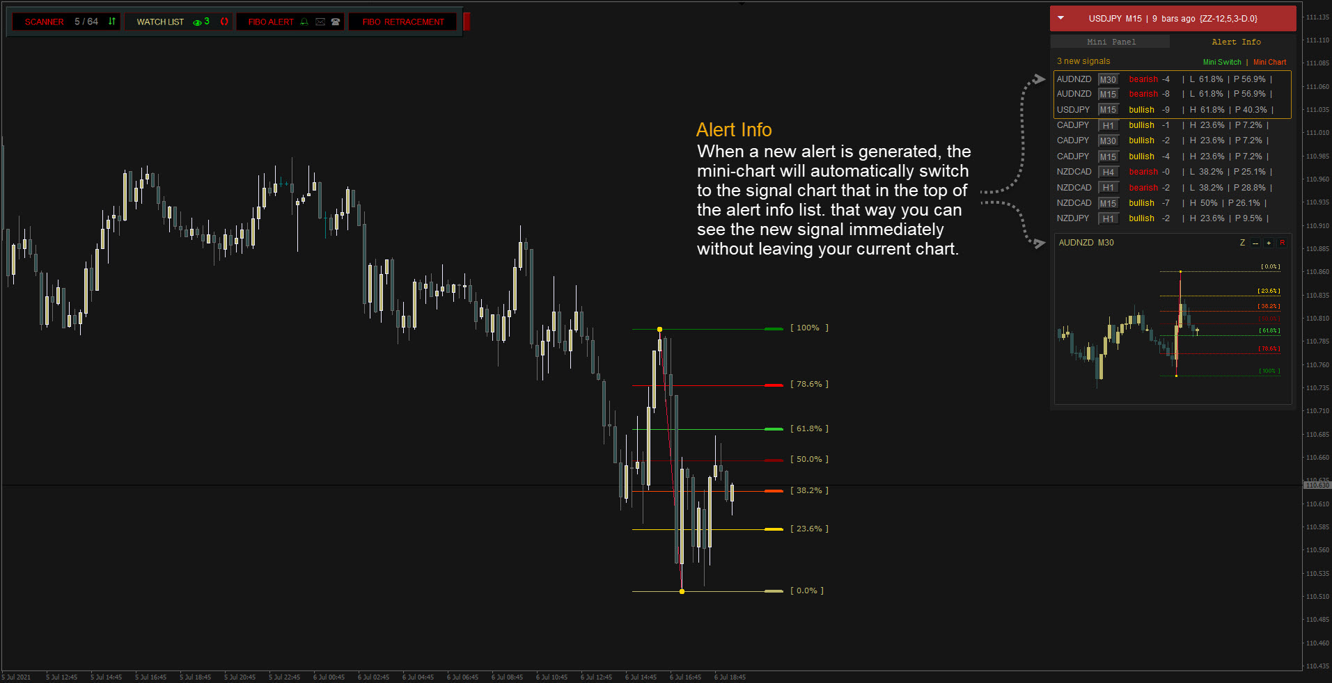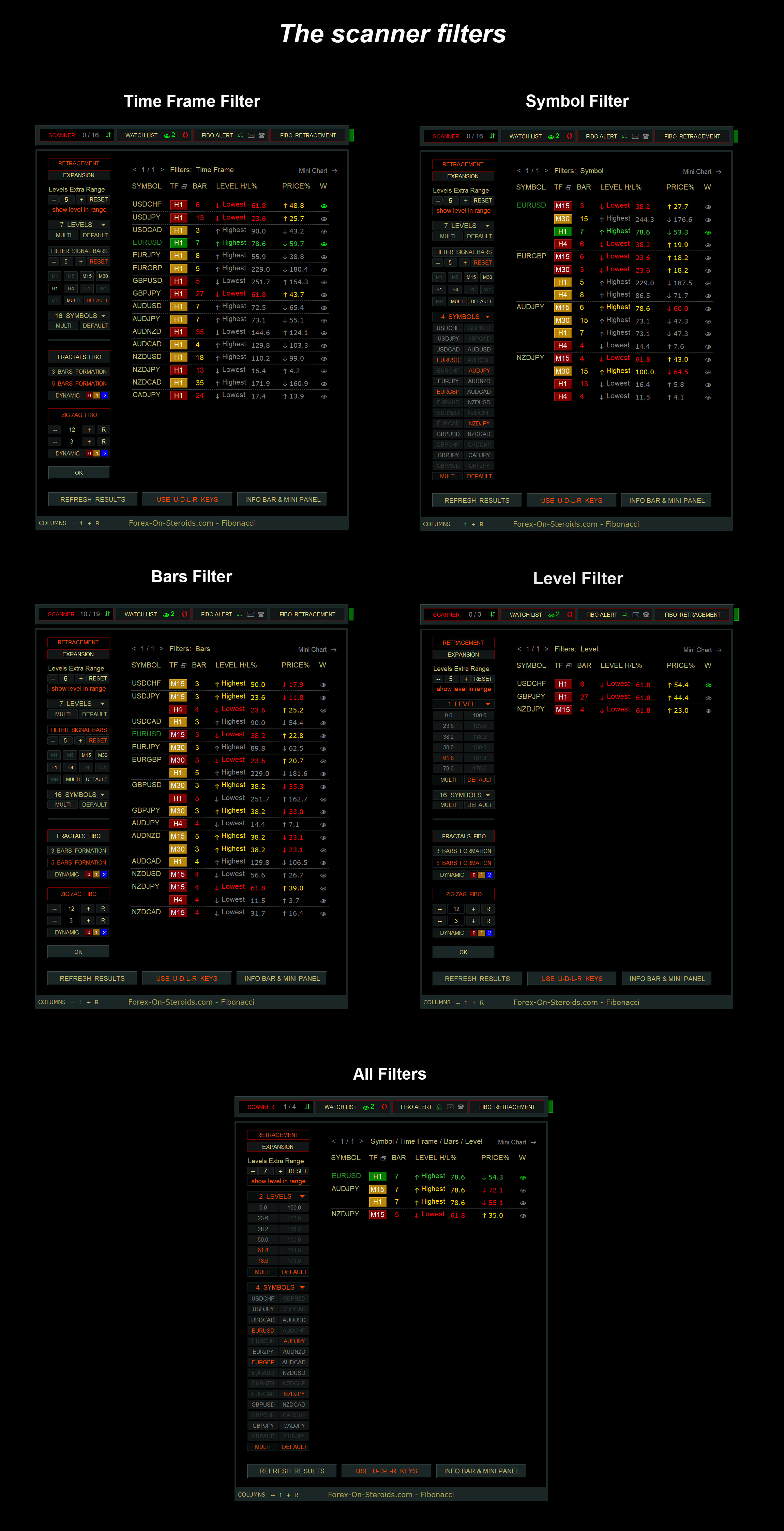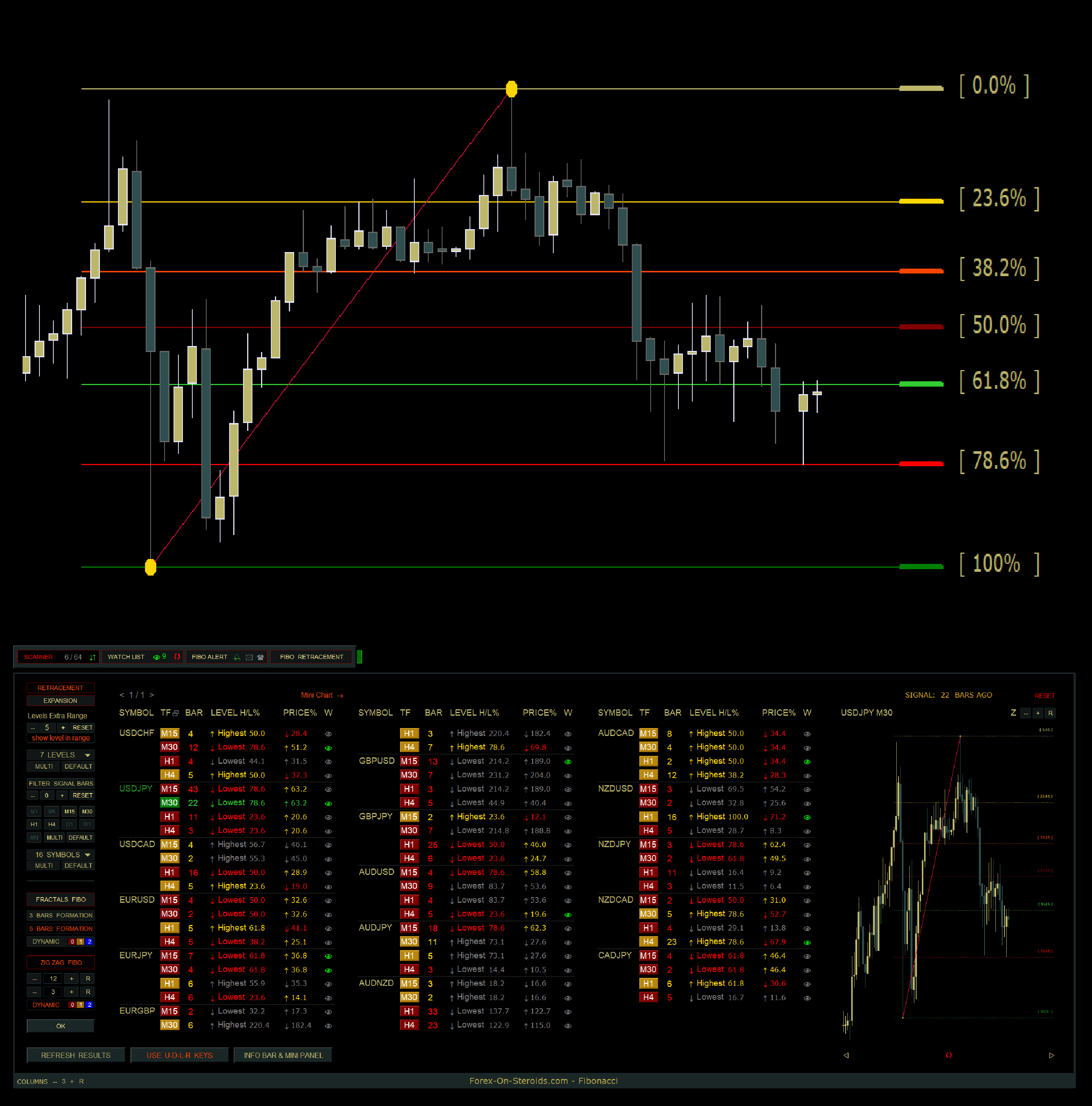 The Fibonacci Scanner displays all detected Fibonacci on one convenient panel.