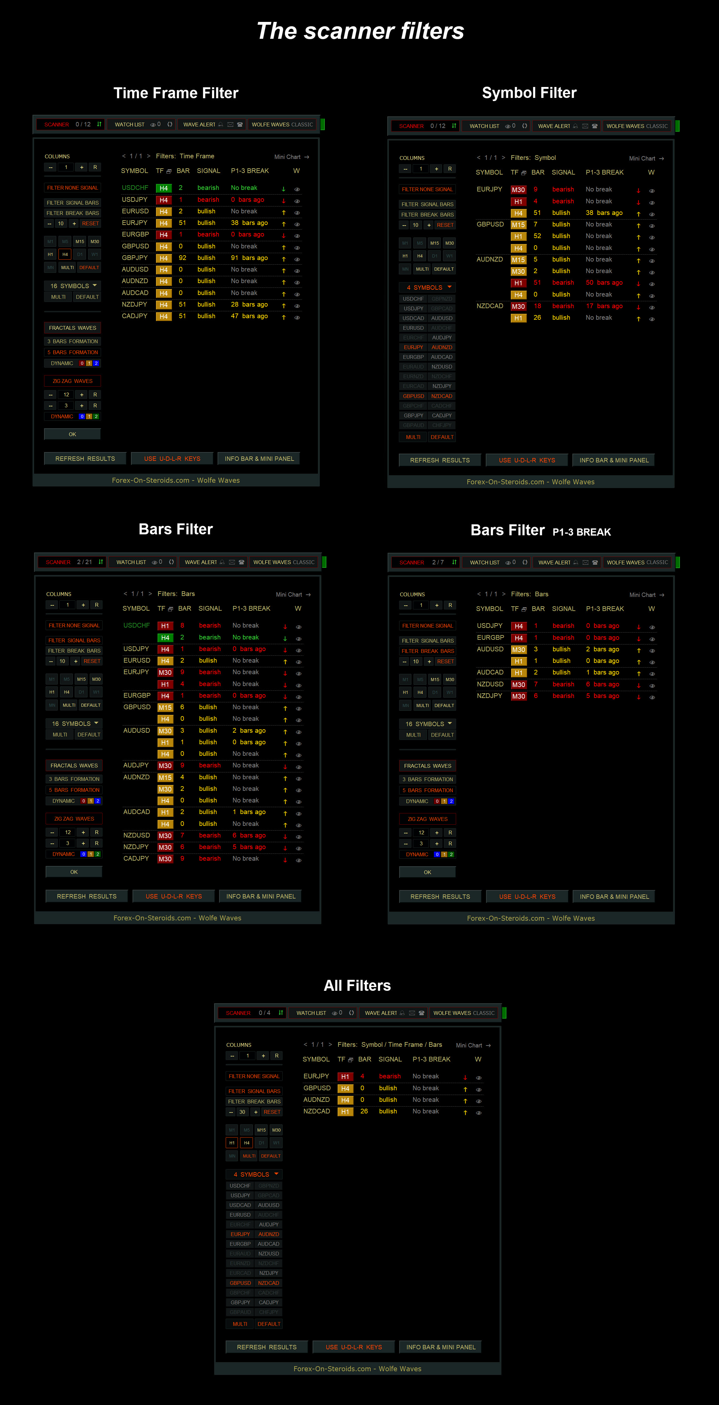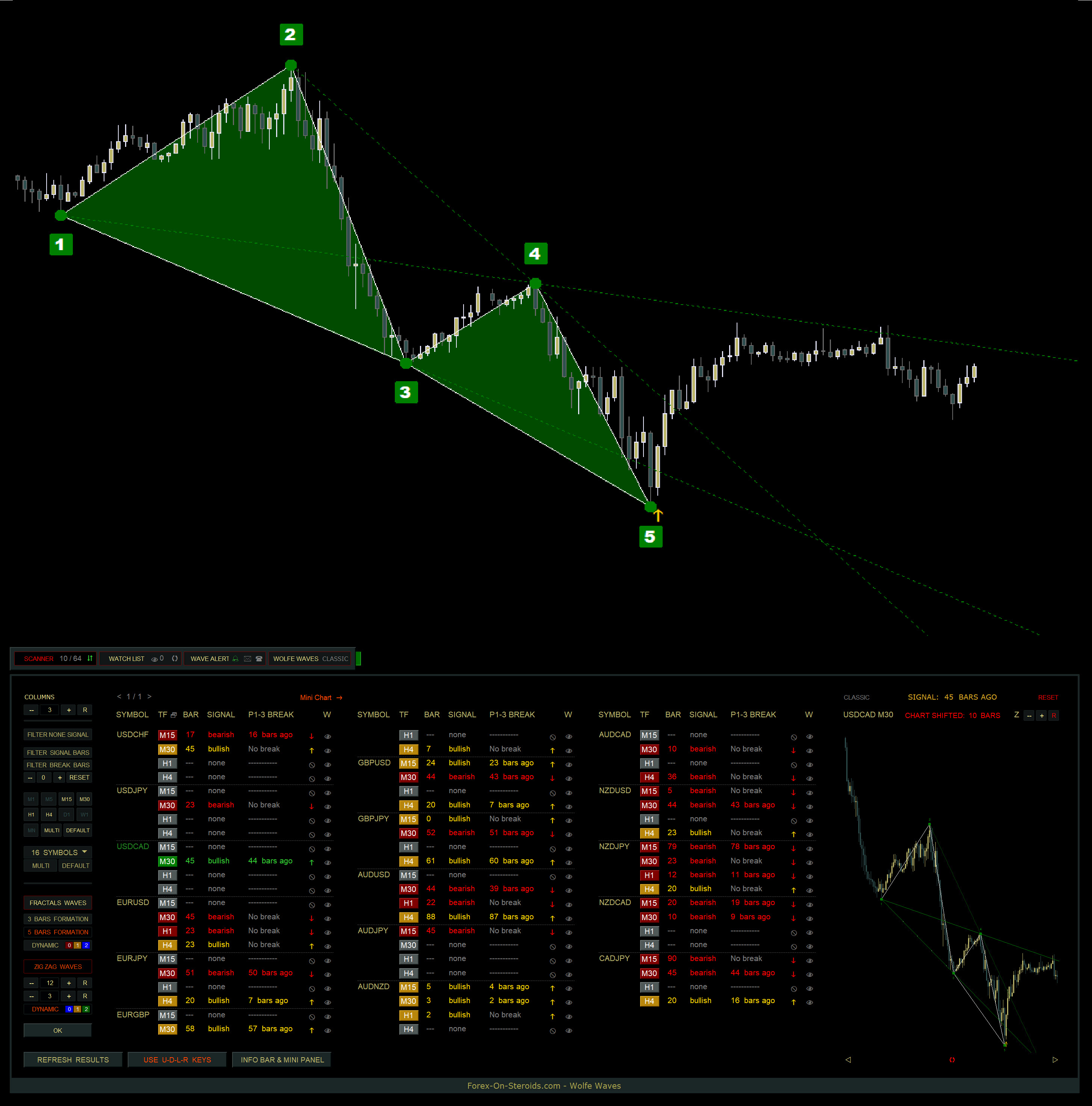 The Wolfe Waves Scanner displays all detected Wolfe Waves on one convenient panel.